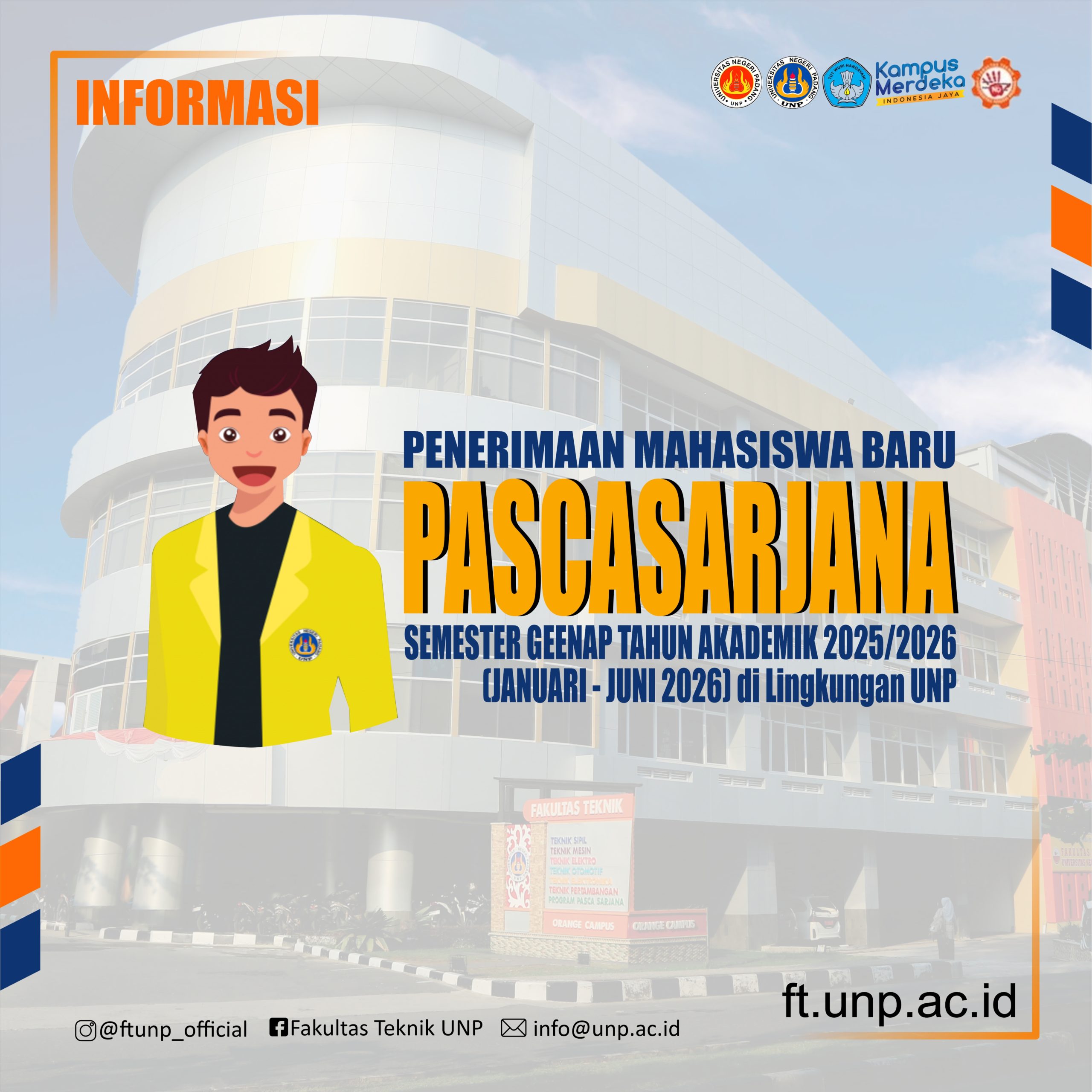 Penerimaan Calon Mahasiswa Baru Pascasarjana Semester Genap Tahun Akademik 2025/2026 (Januari-Juni 2026) di Lingkungan Universitas Negeri Padang. Informasi selengkapnya: https://spmb.unp.ac.id Penerimaan-mahasiswa-baruUnduh