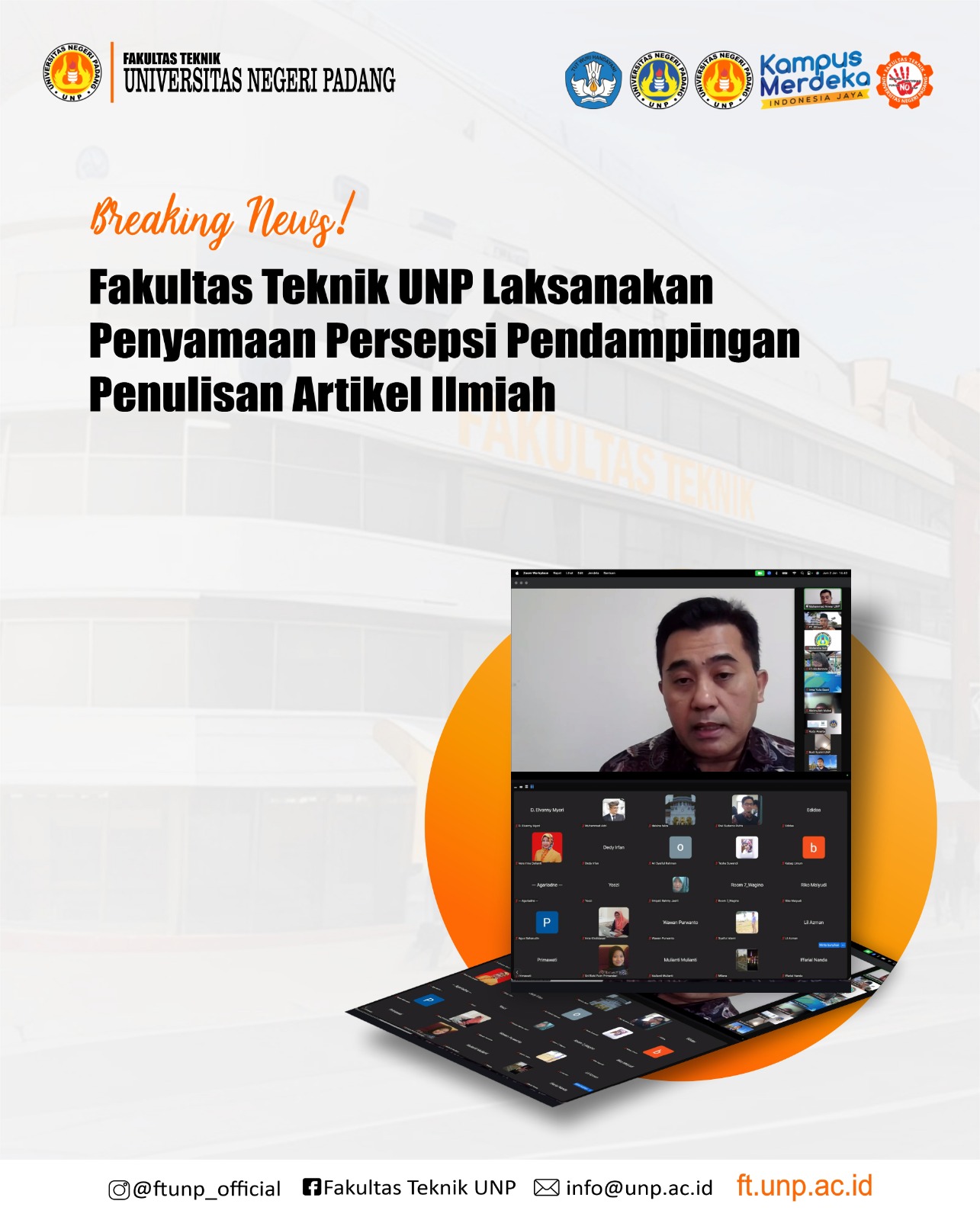 FT UNP_Mengawali tahun 2026, Fakultas Teknik Universitas Negeri Padang (FT UNP) melaksanakan kegiatan Penyamaan Persepsi Pendampingan Penulisan Artikel Ilmiah secara online/daring pada Jumaat (02/01/2026). Kegiatan di ikuti oleh Dosen yang berpotensi akan diusulkan untuk naik jabatan dari Lektor ke Lektor Kepala dan Guru Besar. Dr. Elfizon, S.Pd.,M.Pd.T selaku Wakil Dekan Bidang Keuangan, Sumberdaya, Kerjasama dan...Read More