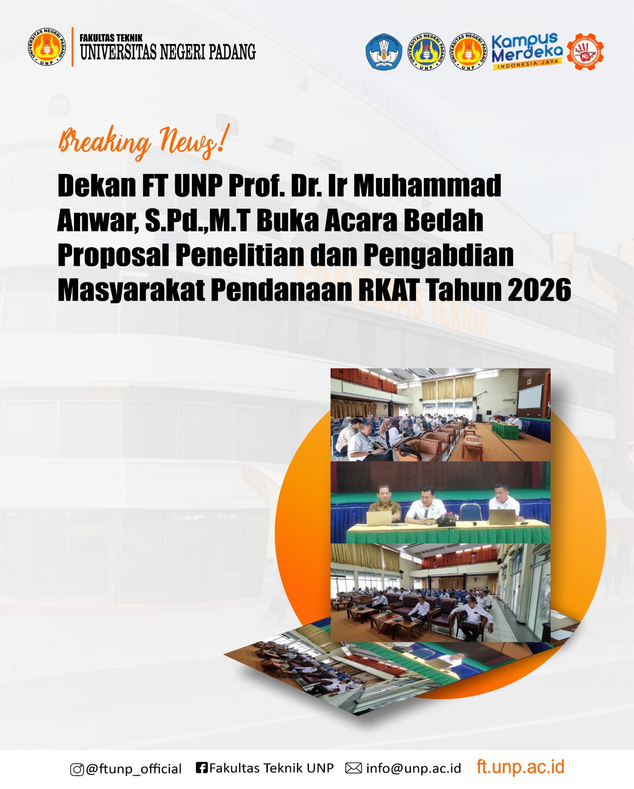 FT UNP_Dalam upaya meningkatkan kualitas serta kuantitas publikasi ilmiah dan kontribusi nyata kepada masyarakat, Fakultas Teknik Universitas Negeri Padang (FT UNP) menggelar kegiatan “Bedah Proposal Penelitian dan Pengabdian Masyarakat Pendanaan RKAT Tahun 2026”. Acara yang berlangsung khidmat ini dibuka secara resmi oleh Dekan Fakultas Teknik UNP, Prof. Dr. Ir. Muhammad Anwar, S.T., M.T. Dalam sambutannya,...Read More
