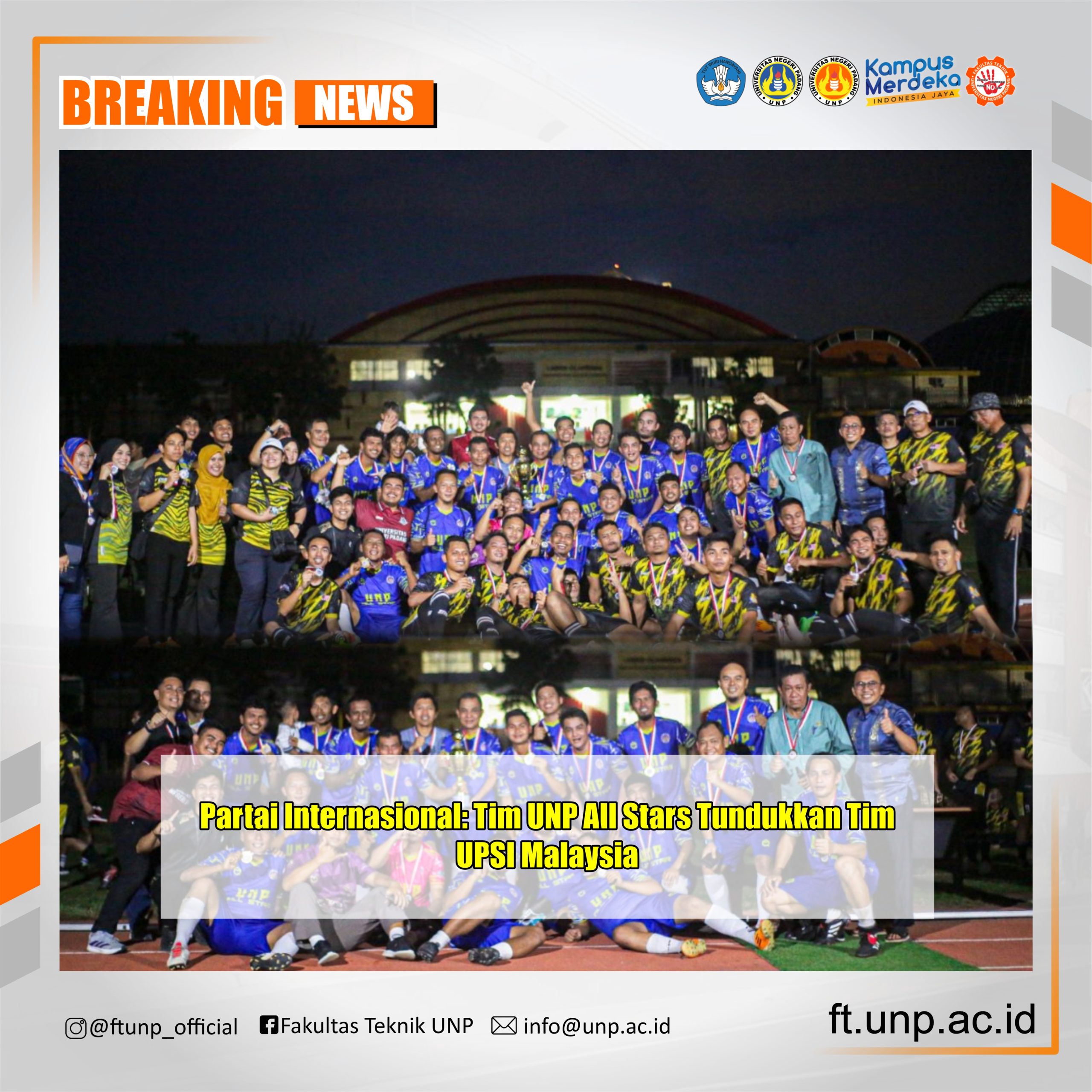 FT UNP_ Sebagai rangkaian agenda Dies Natalis Universitas Negeri Padang (UNP) ke-71, digelar pertandingan internasional serumpun antarnegara Indonesia dan Malaysia dalam bentuk laga persahabatan sepak bola antara UNP All Stars dan Tim UPSI (Universiti Pendidikan Sultan Idris) Malaysia.Pertandingan tersebut berlangsung di Lapangan Sepak Bola Fakultas Ilmu Keolahragaan (FIK), Kampus UNP Air Tawar. Dalam pertandingan ini, tim UNP...Read More