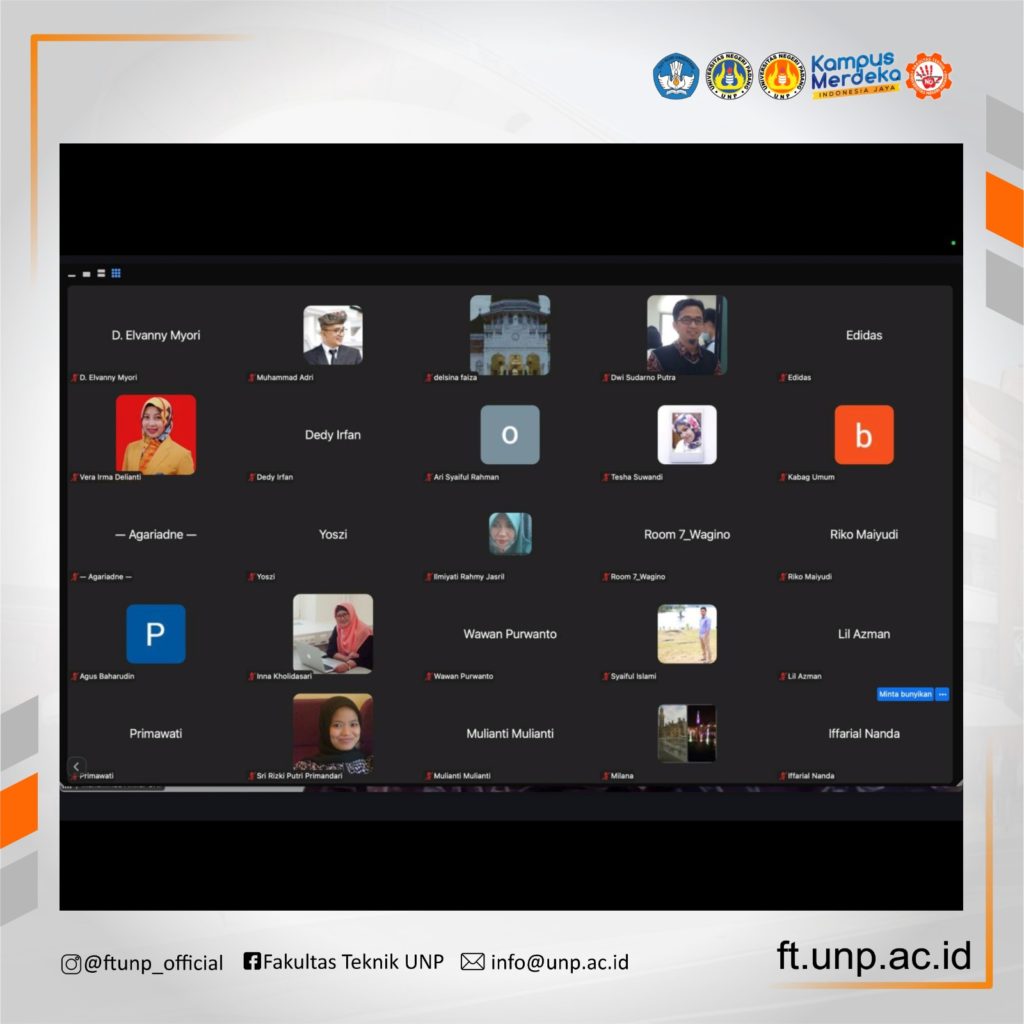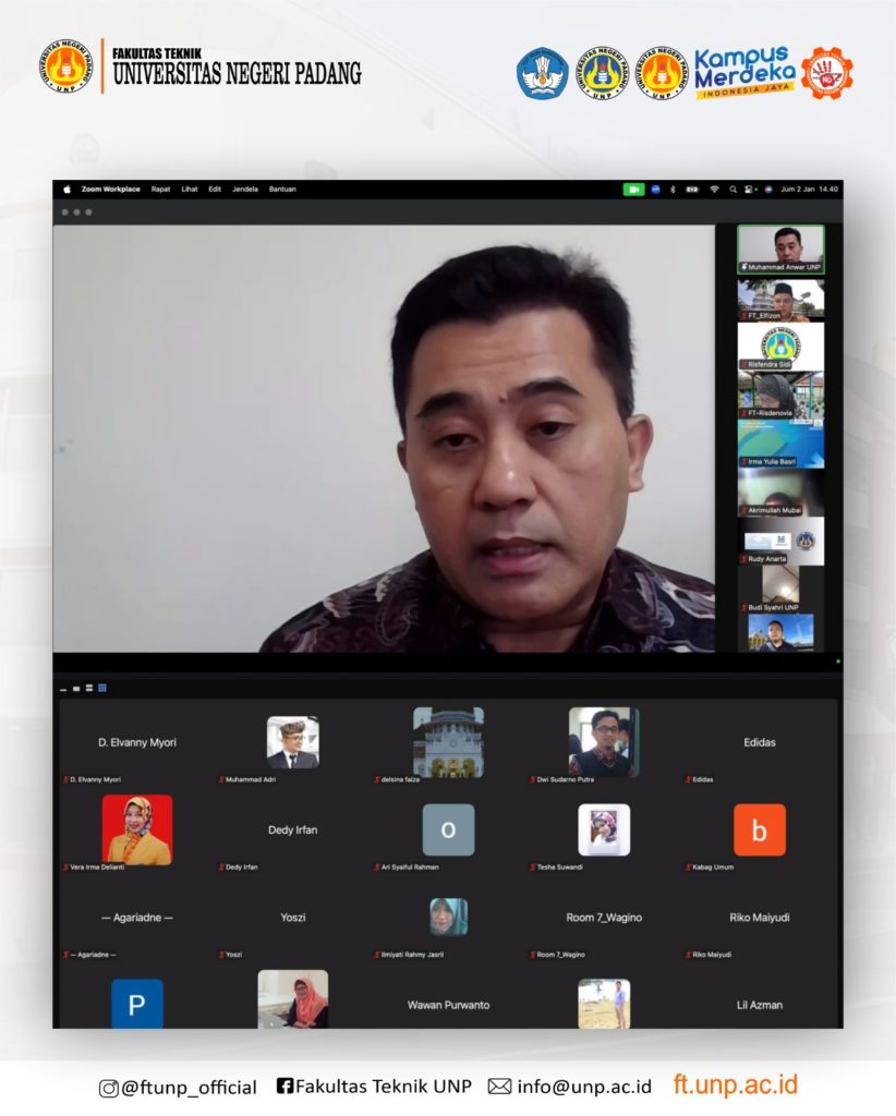FT UNP_Mengawali tahun 2026, Fakultas Teknik Universitas Negeri Padang (FT UNP) melaksanakan kegiatan Penyamaan Persepsi Pendampingan Penulisan Artikel Ilmiah secara online/daring pada Jumaat (02/01/2026). Kegiatan di ikuti oleh Dosen yang berpotensi akan diusulkan untuk naik jabatan dari Lektor ke Lektor Kepala dan Guru Besar.