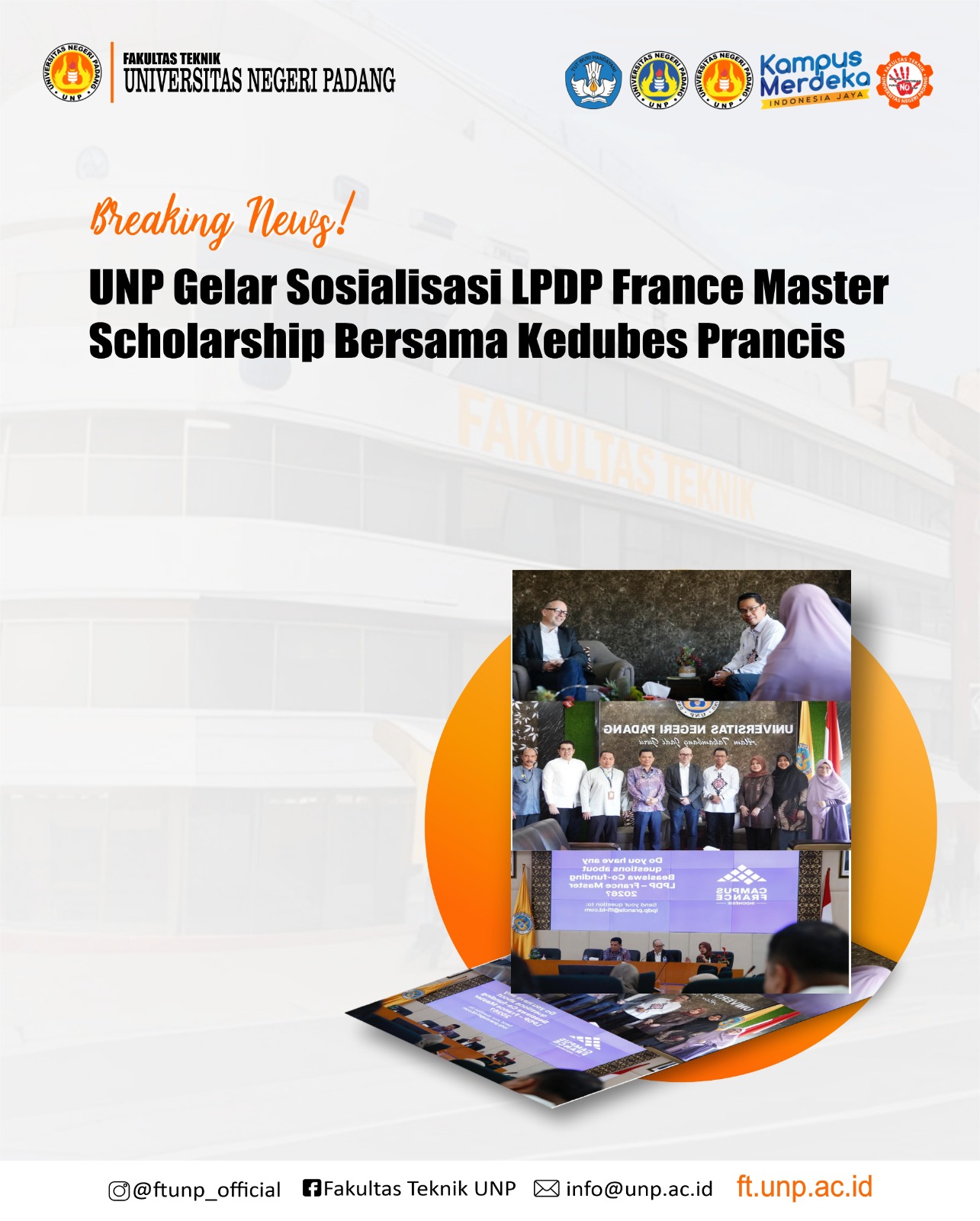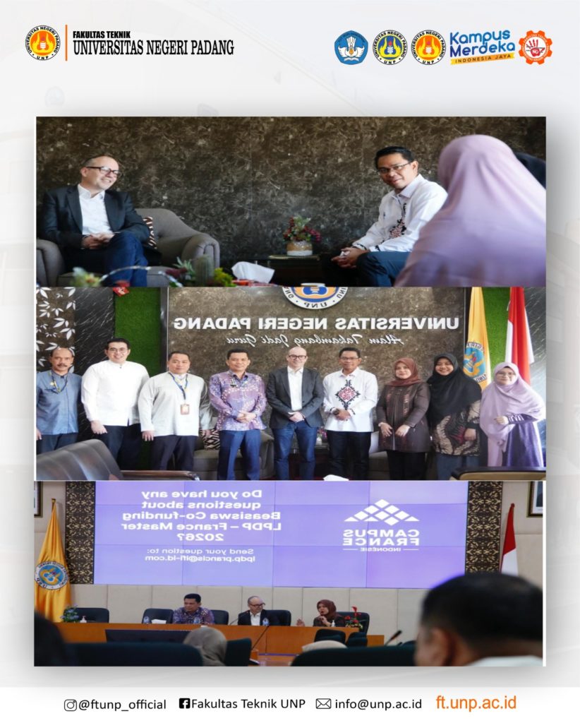 FT UNP_Universitas Negeri Padang (UNP) menggelar kegiatan Information Session on LPDP France Master Scholarship bersama Atase Pendidikan Kedutaan Besar Prancis untuk Indonesia, Antoine Bricout, pada Jumat (6/2/2026). Kegiatan yang digelar di Ruang Sidang Senat ini menjadi wadah bagi mahasiswa dan lulusan yang berminat melanjutkan studi ke Prancis untuk memperoleh informasi langsung terkait peluang beasiswa, sistem pendidikan tinggi, serta strategi persiapan studi luar negeri.