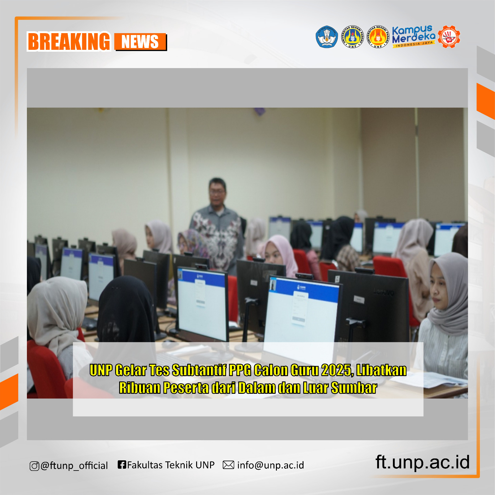 FT UNP_Universitas Negeri Padang (UNP) kembali menyelenggarakan Tes Substantif Pendidikan Profesi Guru (PPG) Calon Guru Tahun 2025. Ujian yang menjadi tahapan penting bagi calon guru profesional ini digelar selama empat hari, mulai 12 hingga 15 November 2025, dan berpusat di tiga lokasi kampus UNP: Gedung PPG, Gedung Bagonjong, serta Gedung Pusat Informasi dan Perpustakaan. Suasana antusias tampak sejak hari pertama pelaksanaan, seiring partisipasi ribuan peserta dari berbagai daerah di dalam dan luar Sumbar.Â