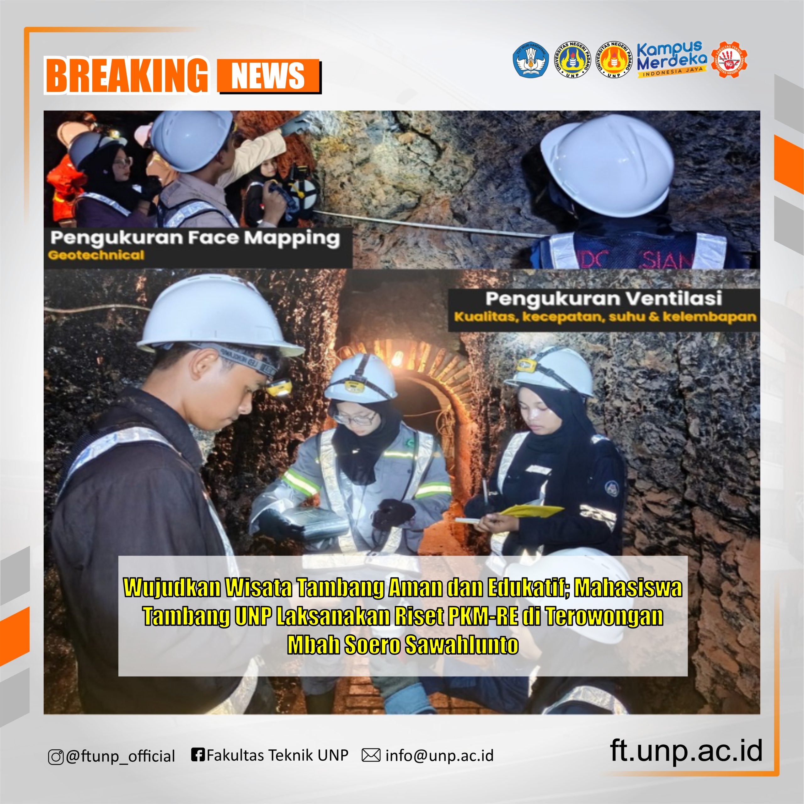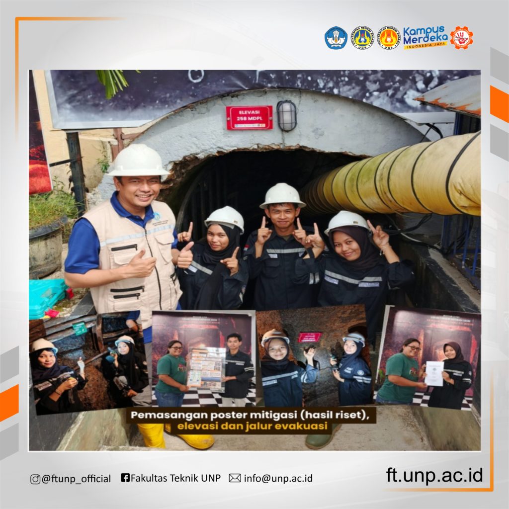 FT UNP_Inovasi penelitian dari kampus kembali mengemuka. Tim mahasiswa Jurusan Teknik Pertambangan Universitas Negeri Padang (UNP) sukses melaksanakan Program Kreativitas Mahasiswa Riset Eksakta (PKM-RE) bertajuk “Analisis Stabilitas Batuan dan Ventilasi serta Strategi Mitigasi Bencana untuk Pengembangan Wisata Tambang Aman di Terowongan Mbah Soero Sawahlunto.”